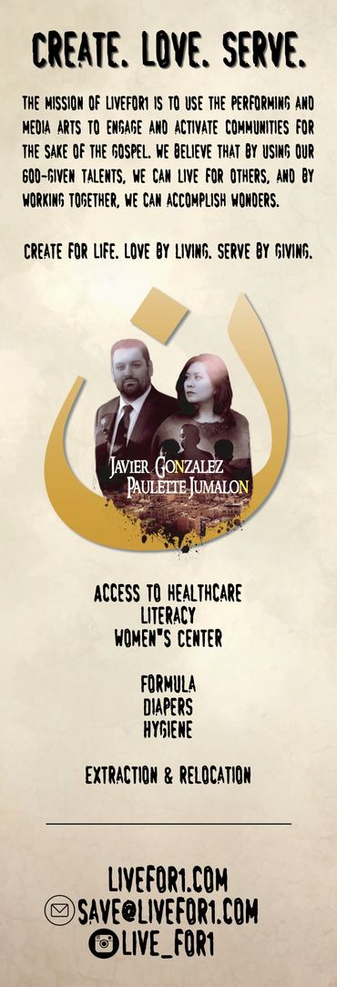 The mission of LiveFor1 is to use the performing and media arts to engage and activate communities for the sake and support of refugees who have been persecuted for their faith. We believe that by using our God-given talents, we can live for others, and by working together, we can accomplish wonders. Create for Life. Love by living. Serve