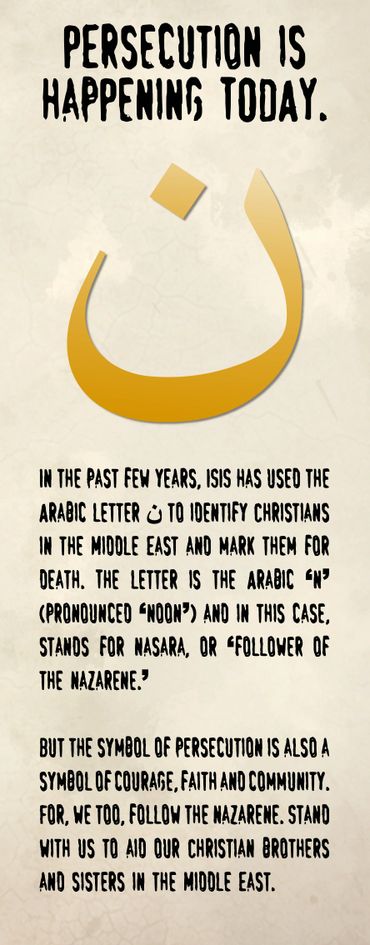 The Arabic letter shown in the picture above has become the universal symbol to identify those who follow the Nazarene. While some use this symbol to mark Christians for death, others use it as a symbol of courage, faith and community. Together we can stand with our Christian brothers and sisters in the Middle East and say, "I follow the Nazarene."